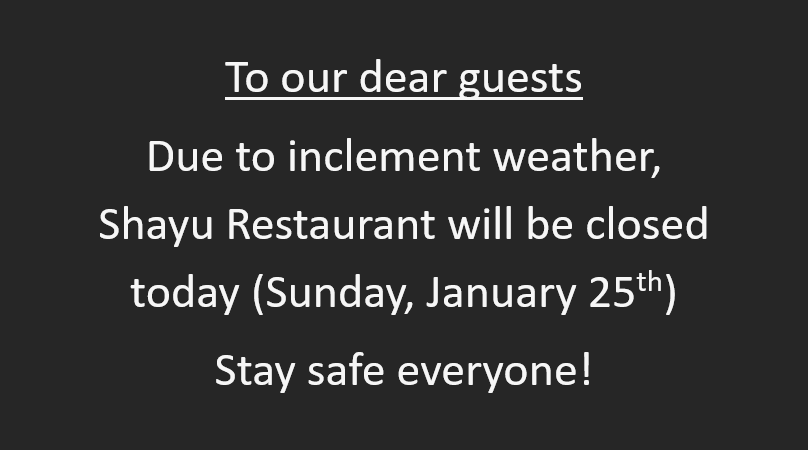 To our dear guests Due to inclement weather, Shayu Restaurant will be closed today (Sunday, January 25th) Stay safe everyone!